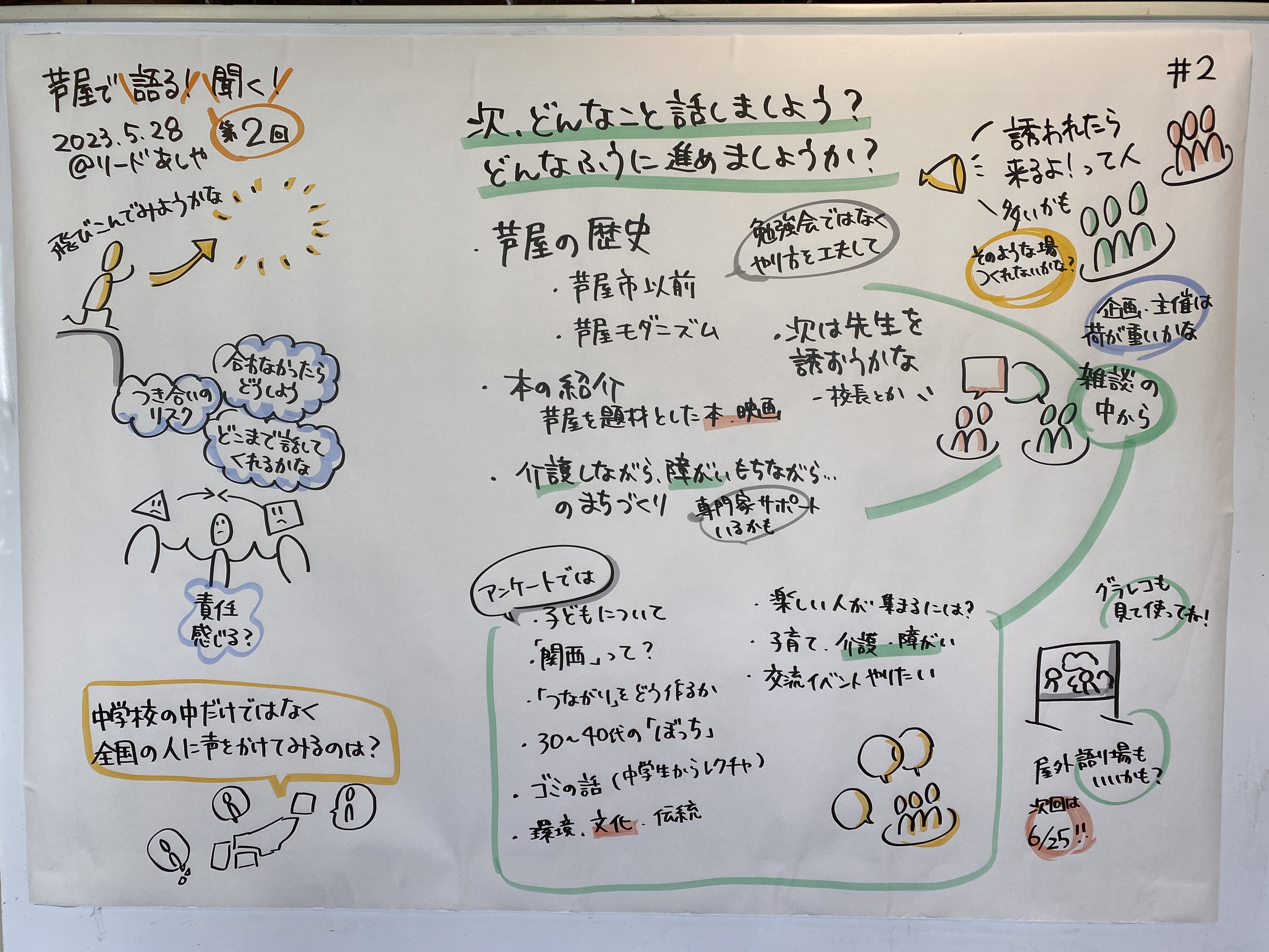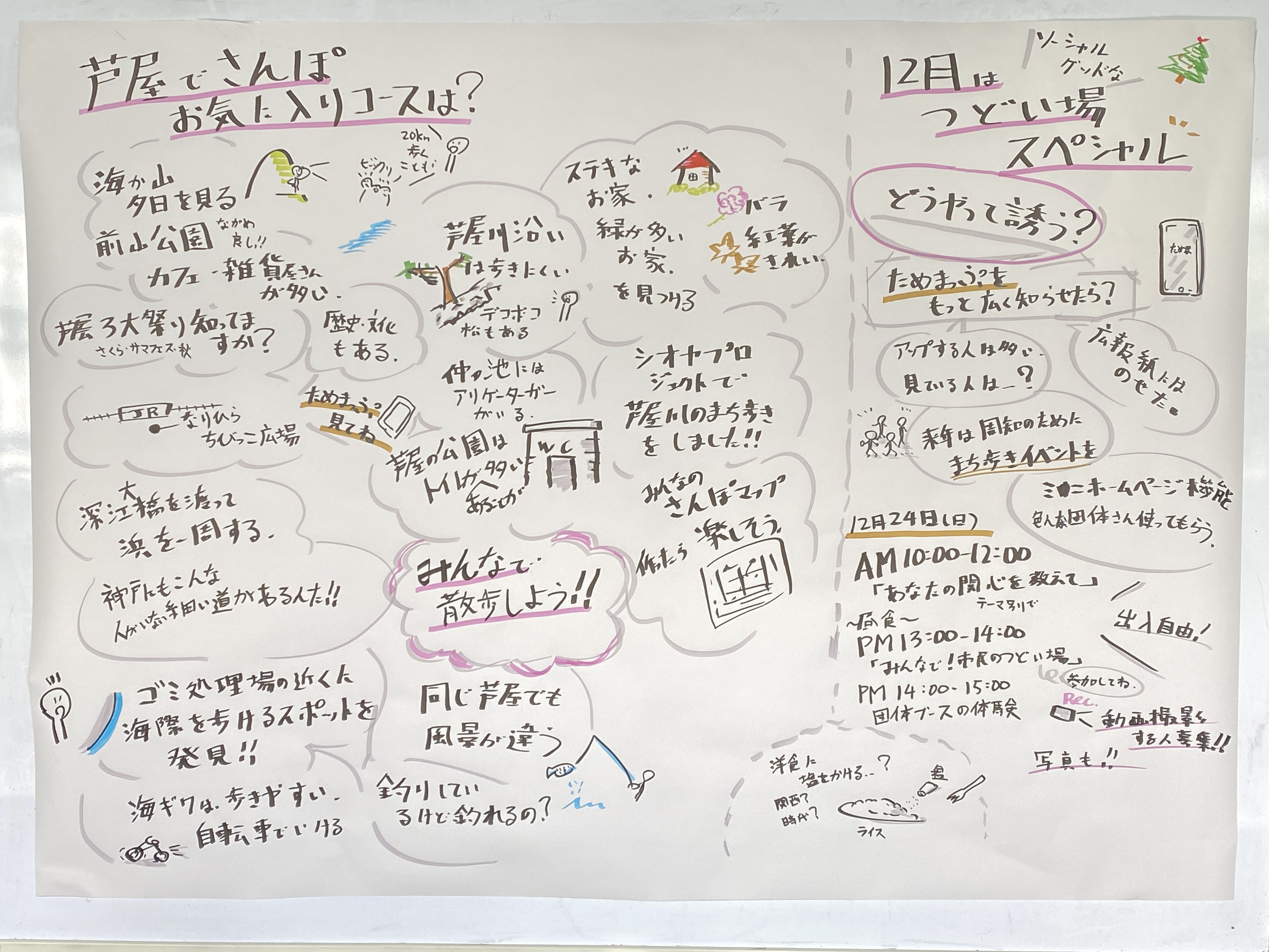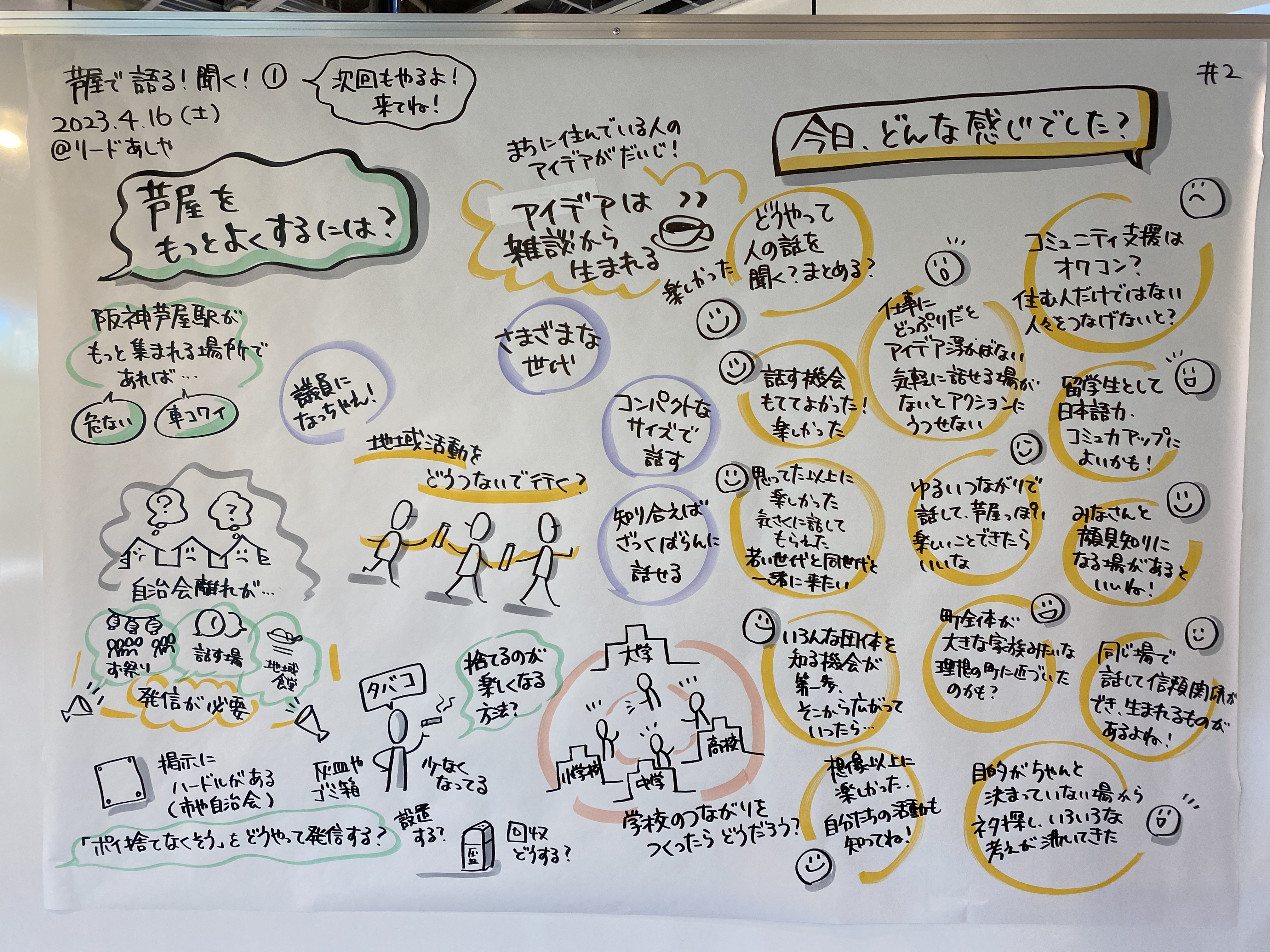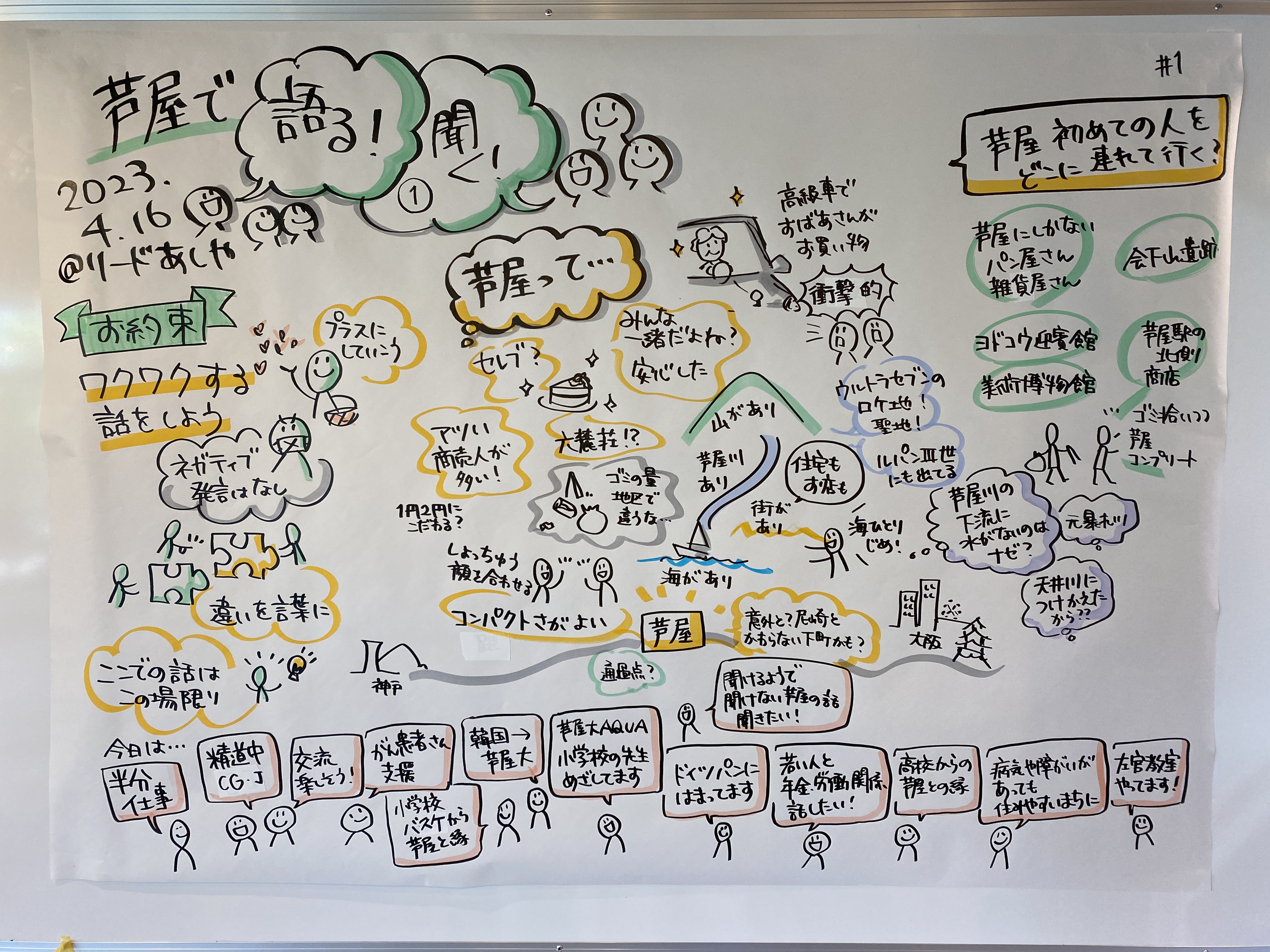芦屋に住んでいる人、働いている人、学んでいる人、活動している人、芦屋に関わっている人たちが集まり、自分のことを語る、日常を語る、だれかとつながる、みんなの話を聞く、みんなでワイワイできる場です。一緒に居場所をづくりをしました。