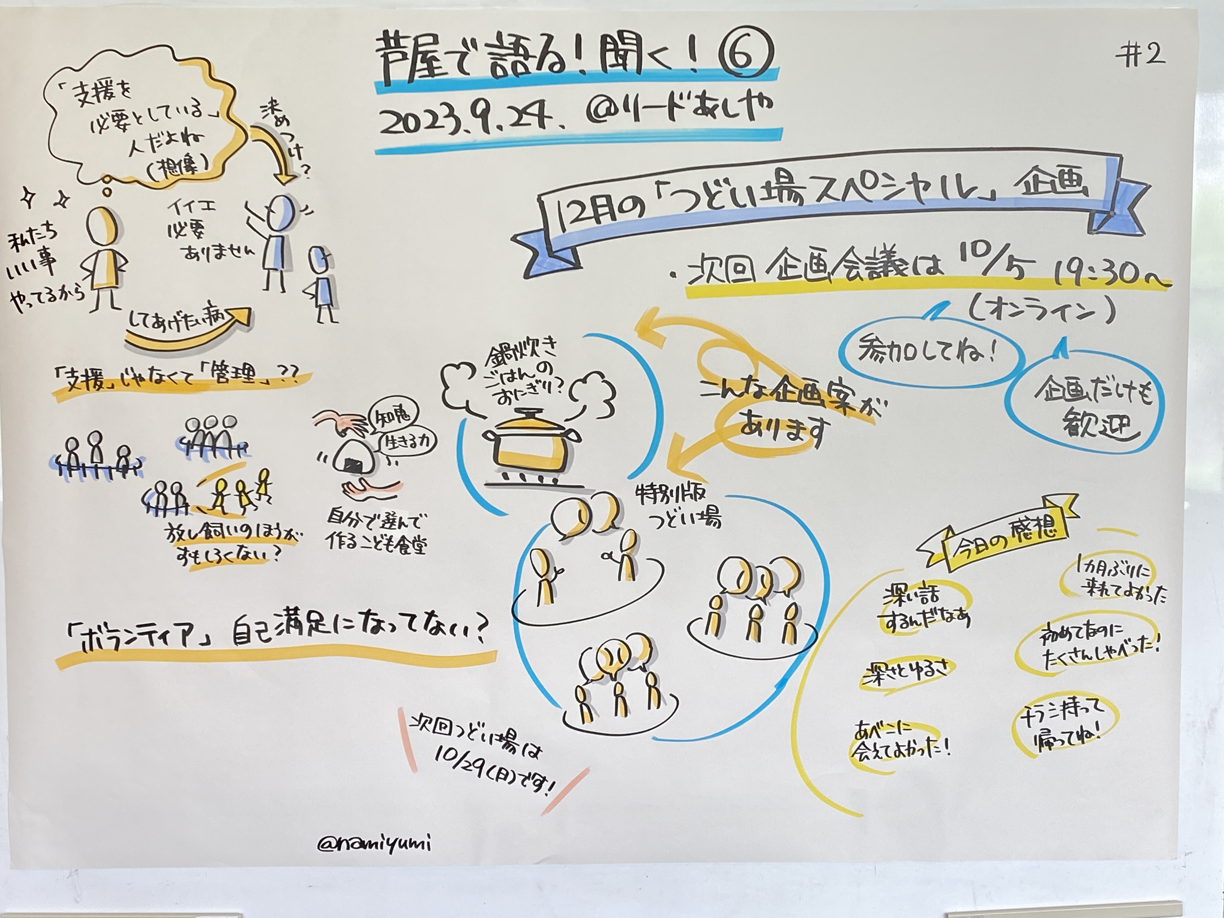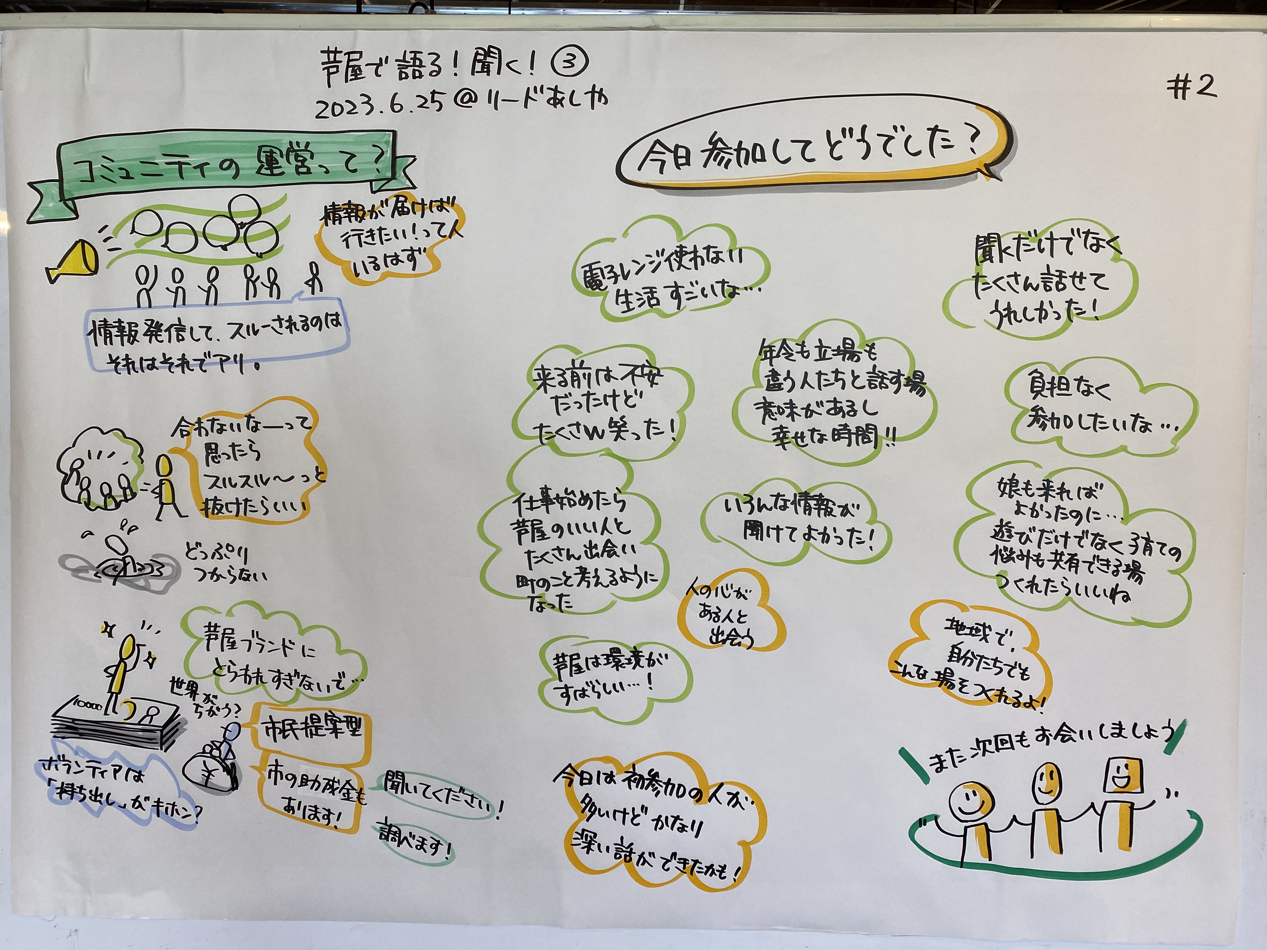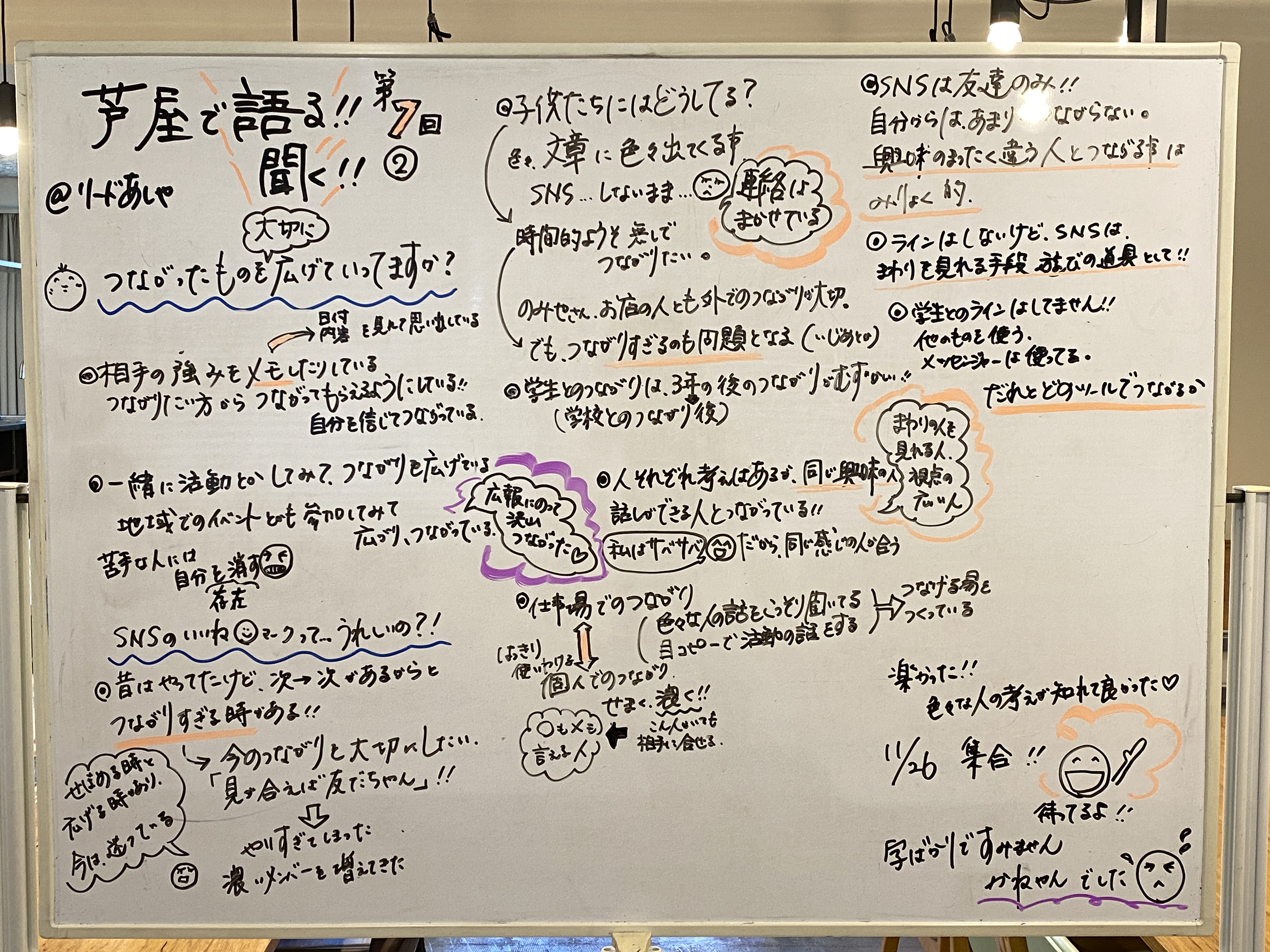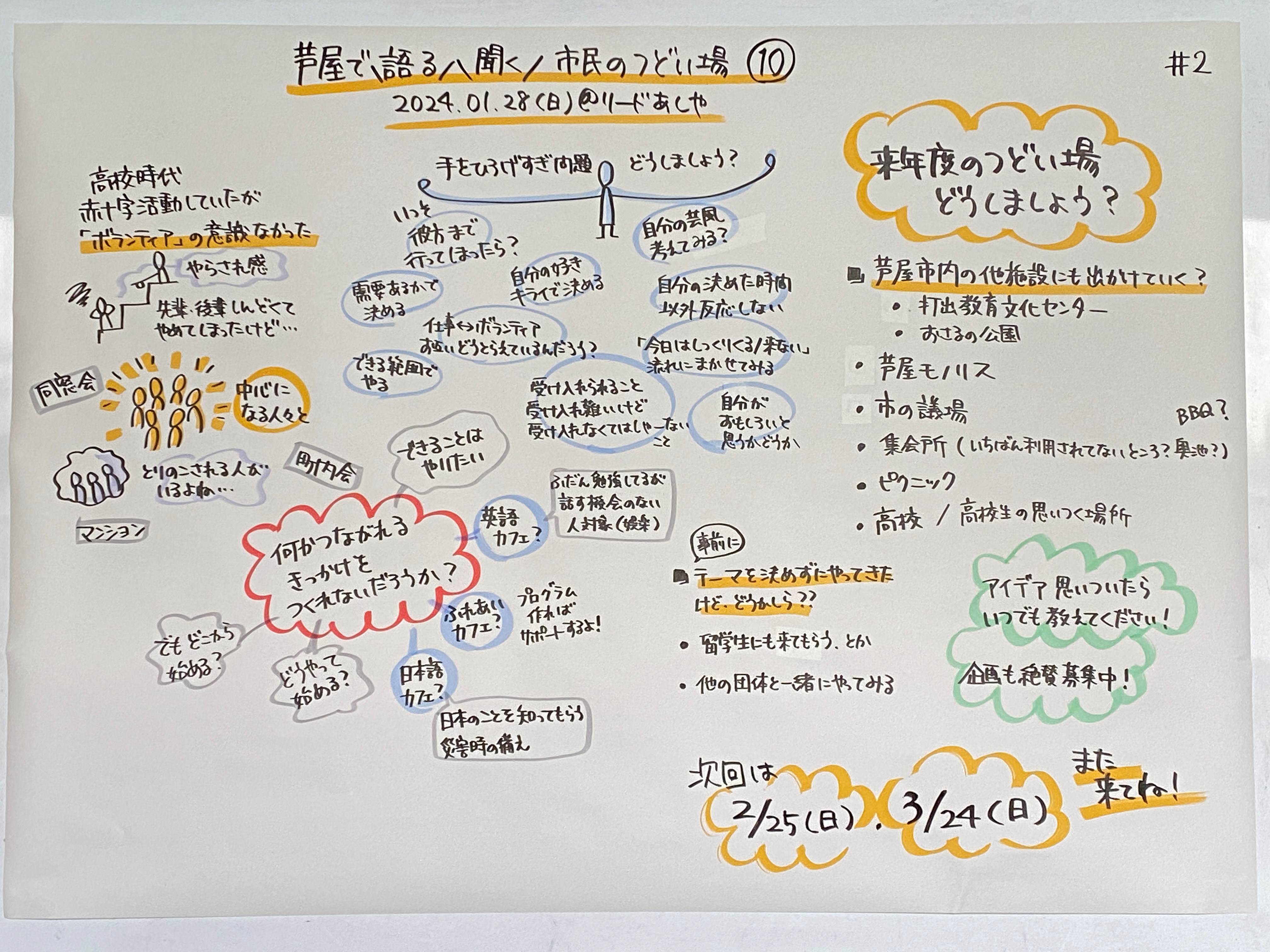 芦屋に住んでいる人、働いている人、学んでいる人、活動している人、芦屋に関わっている人たちが集まり、自分のことを語る、日常を語る、だれかとつながる、みんなの話を聞く、みんなでワイワイできる場です。一緒に居場所をづくりをしました。