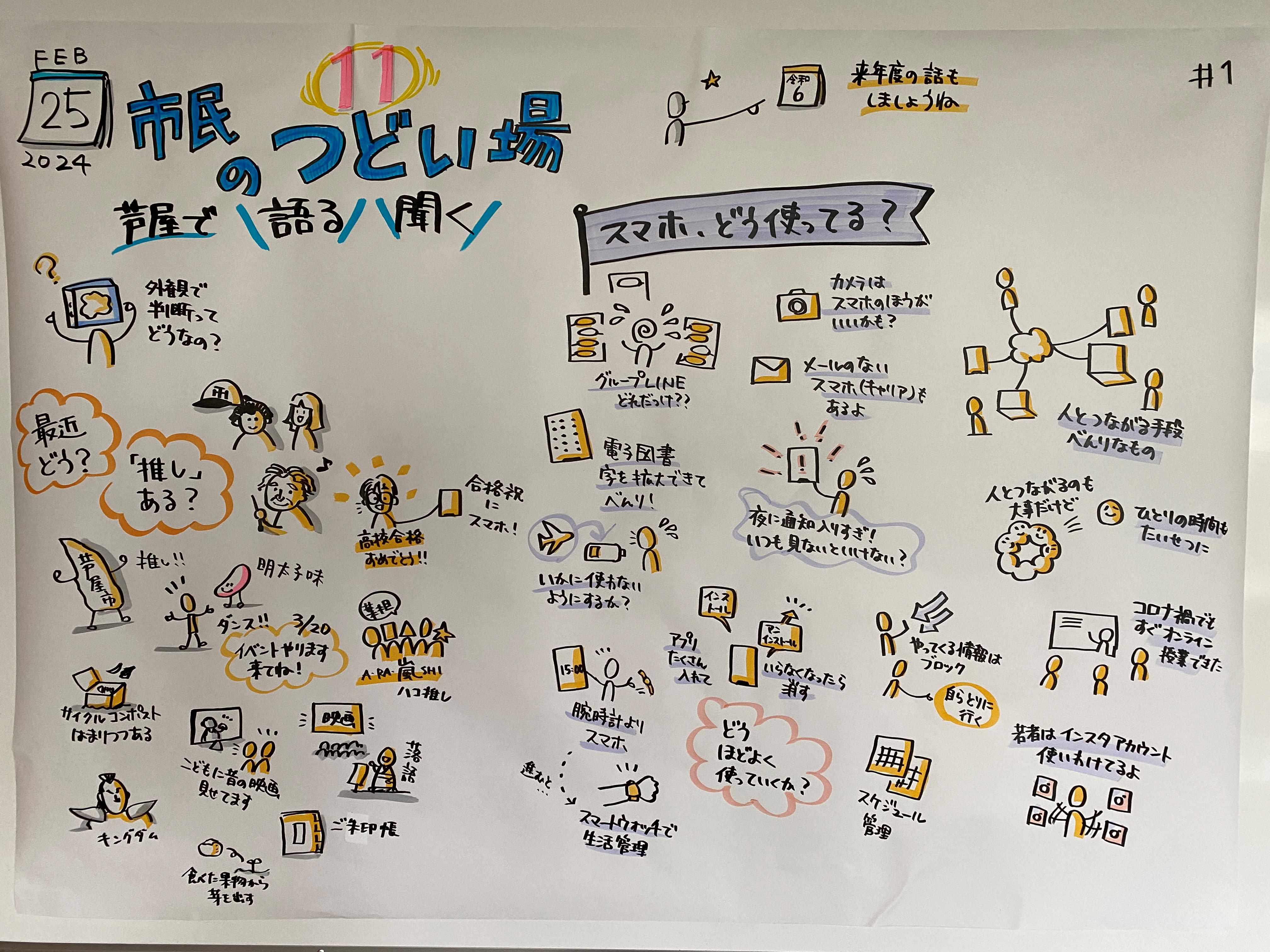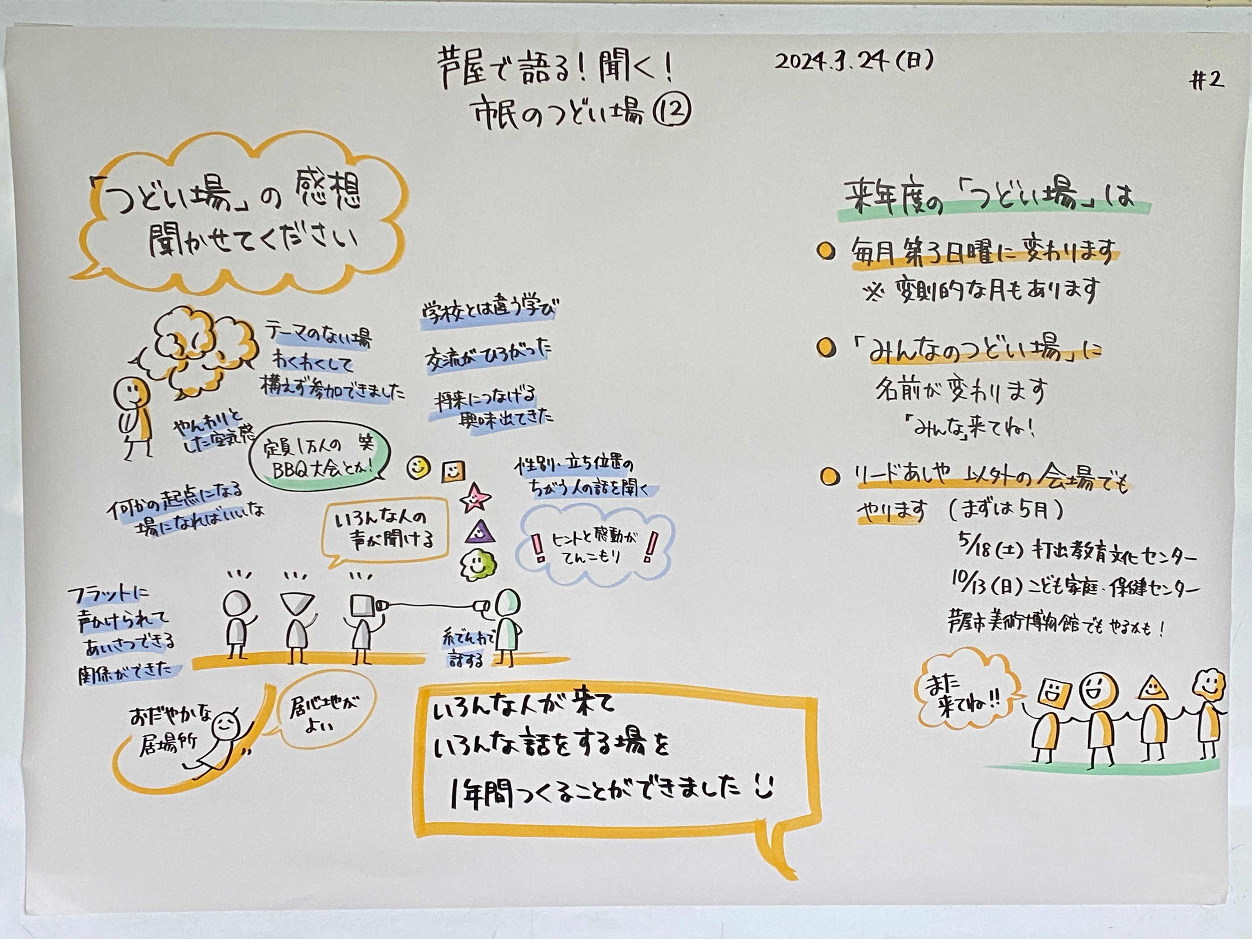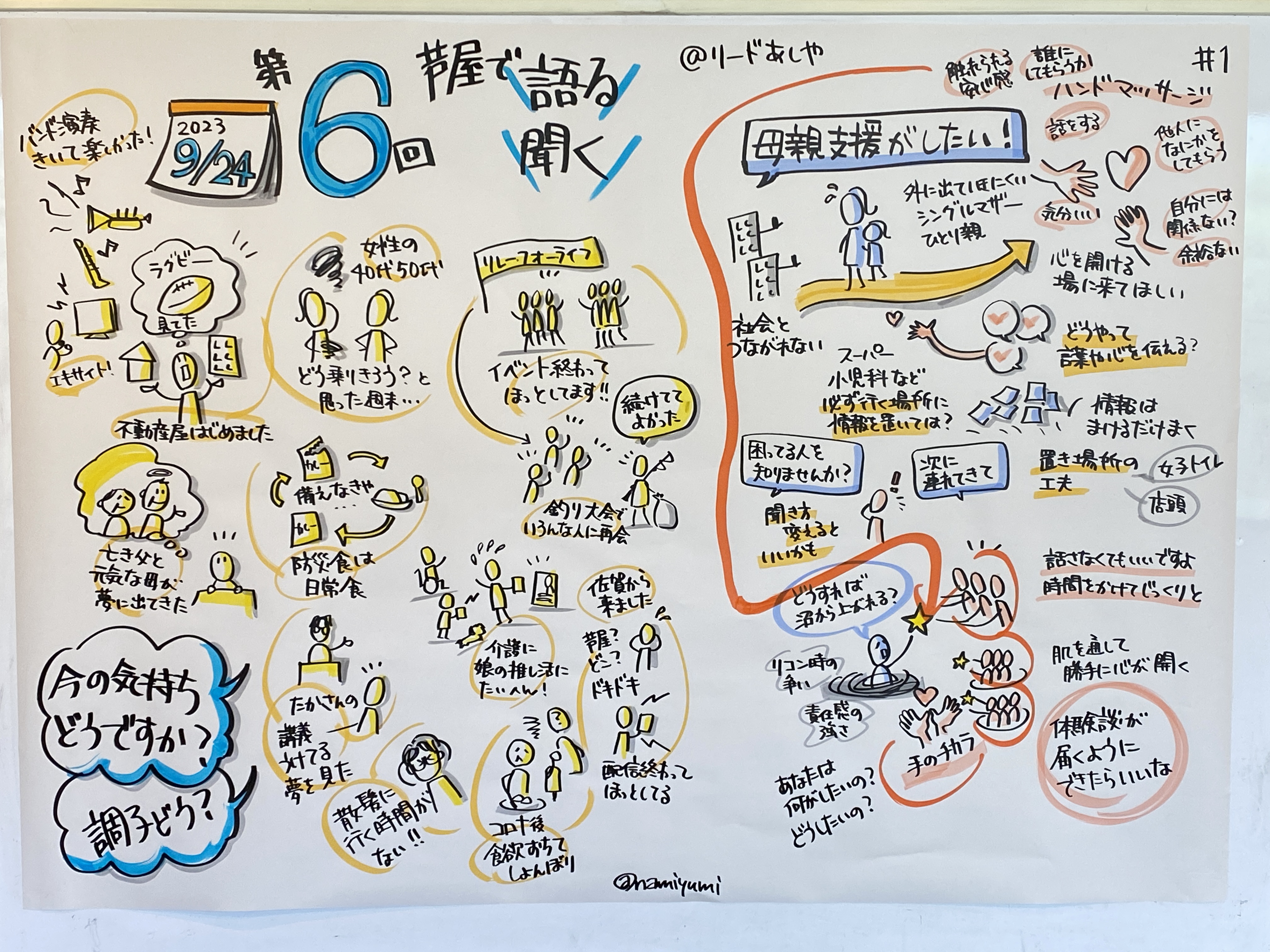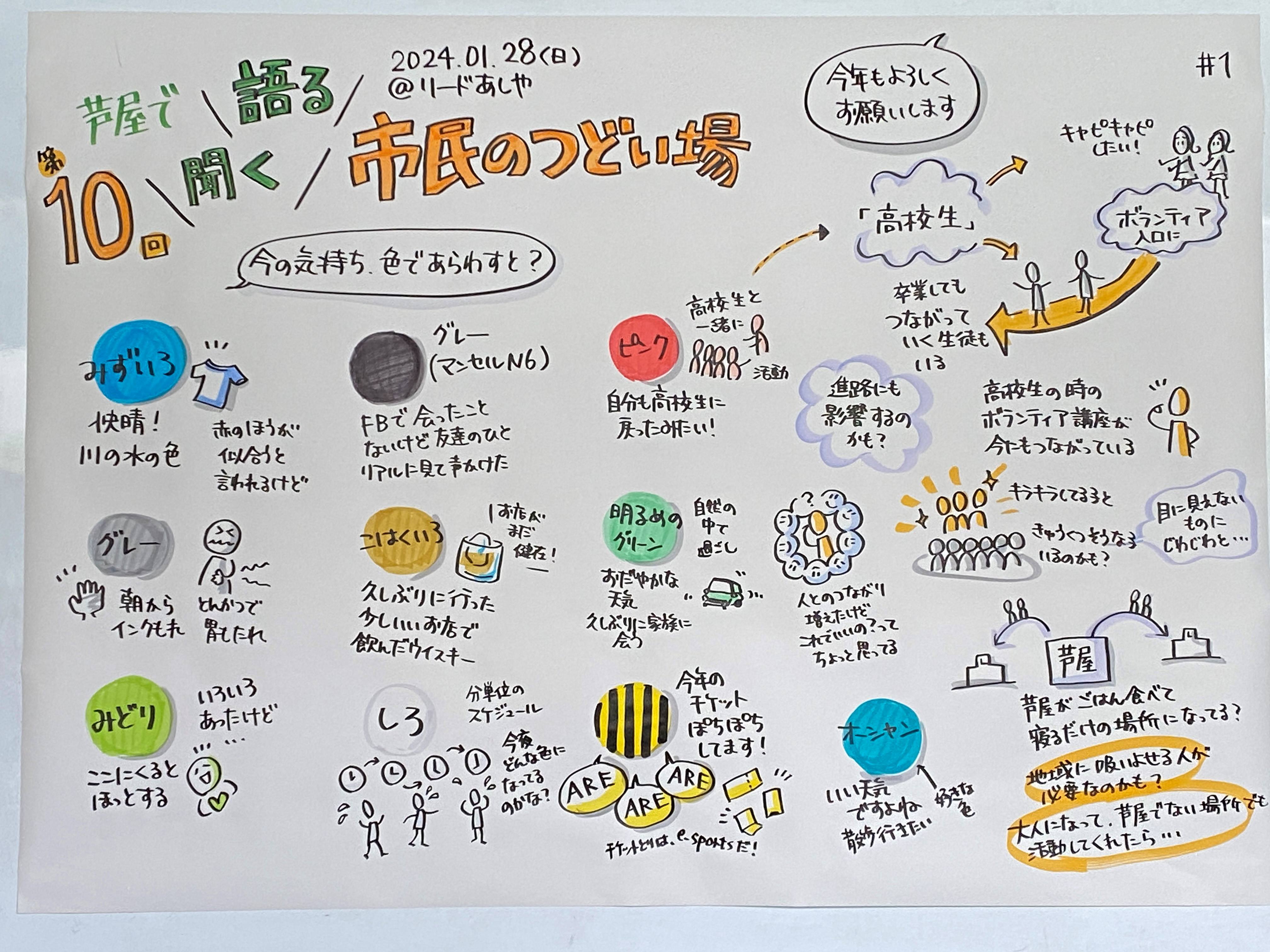 芦屋に住んでいる人、働いている人、学んでいる人、活動している人、芦屋に関わっている人たちが集まり、自分のことを語る、日常を語る、だれかとつながる、みんなの話を聞く、みんなでワイワイできる場です。一緒に居場所をづくりをしました。