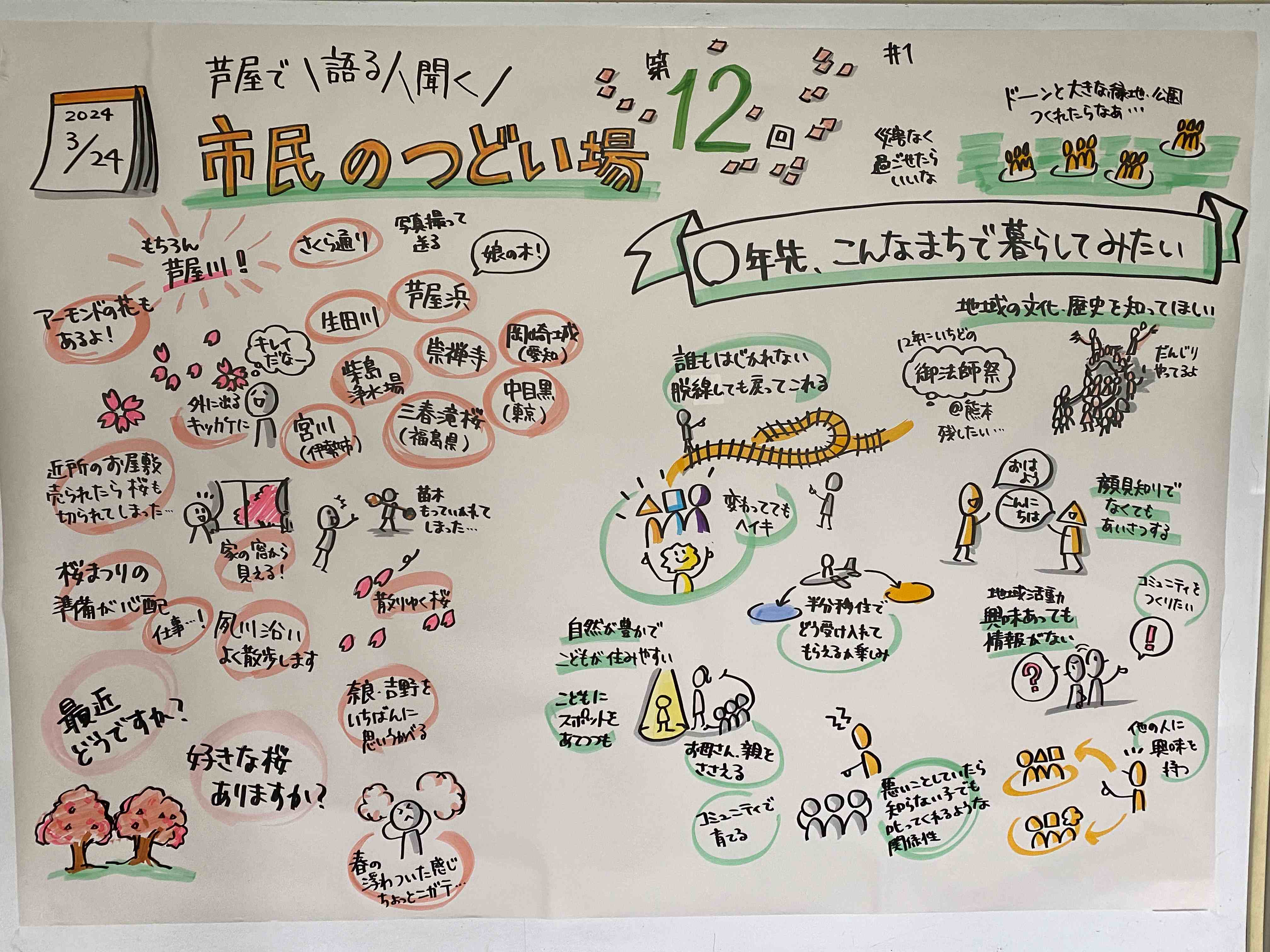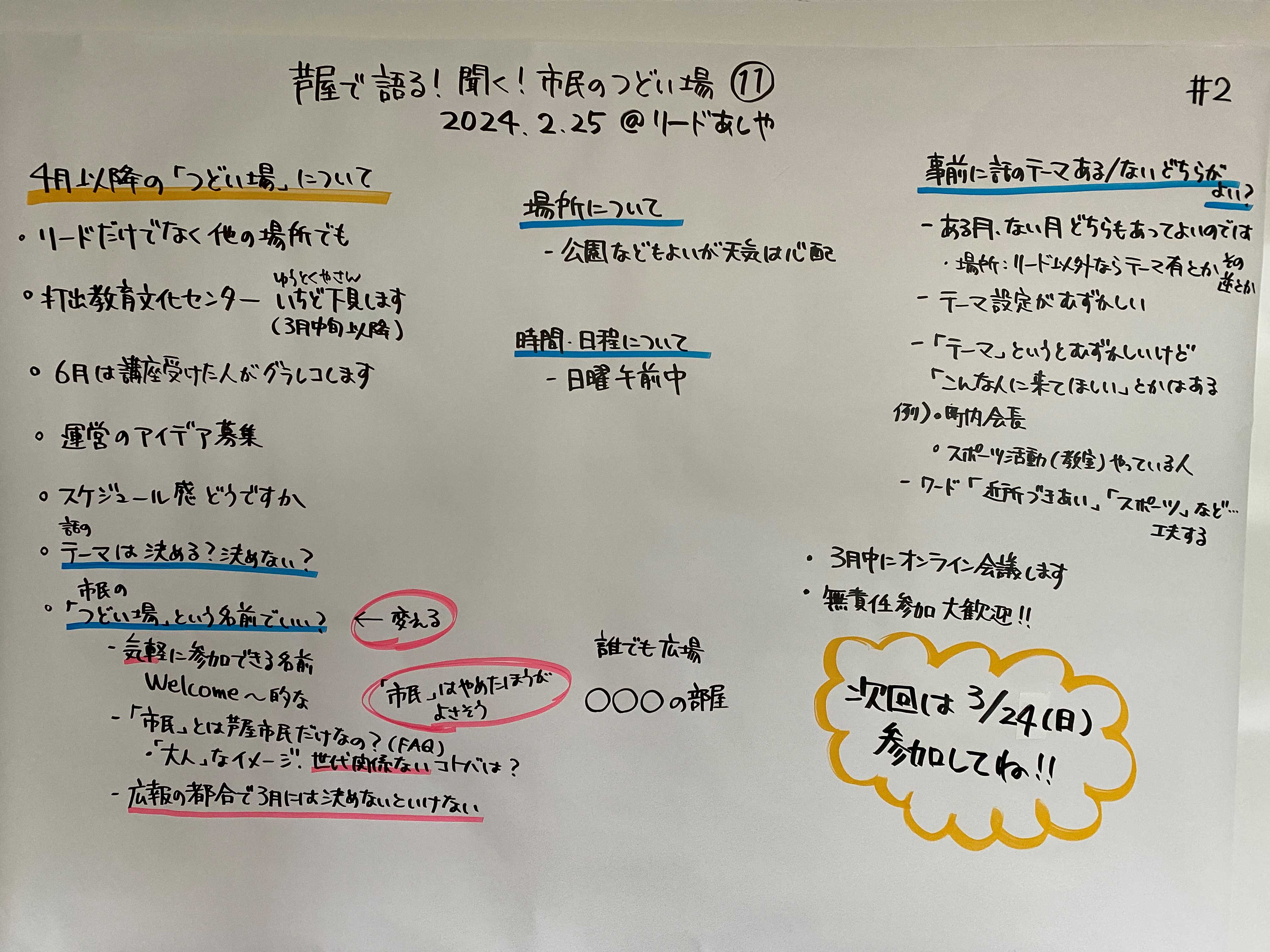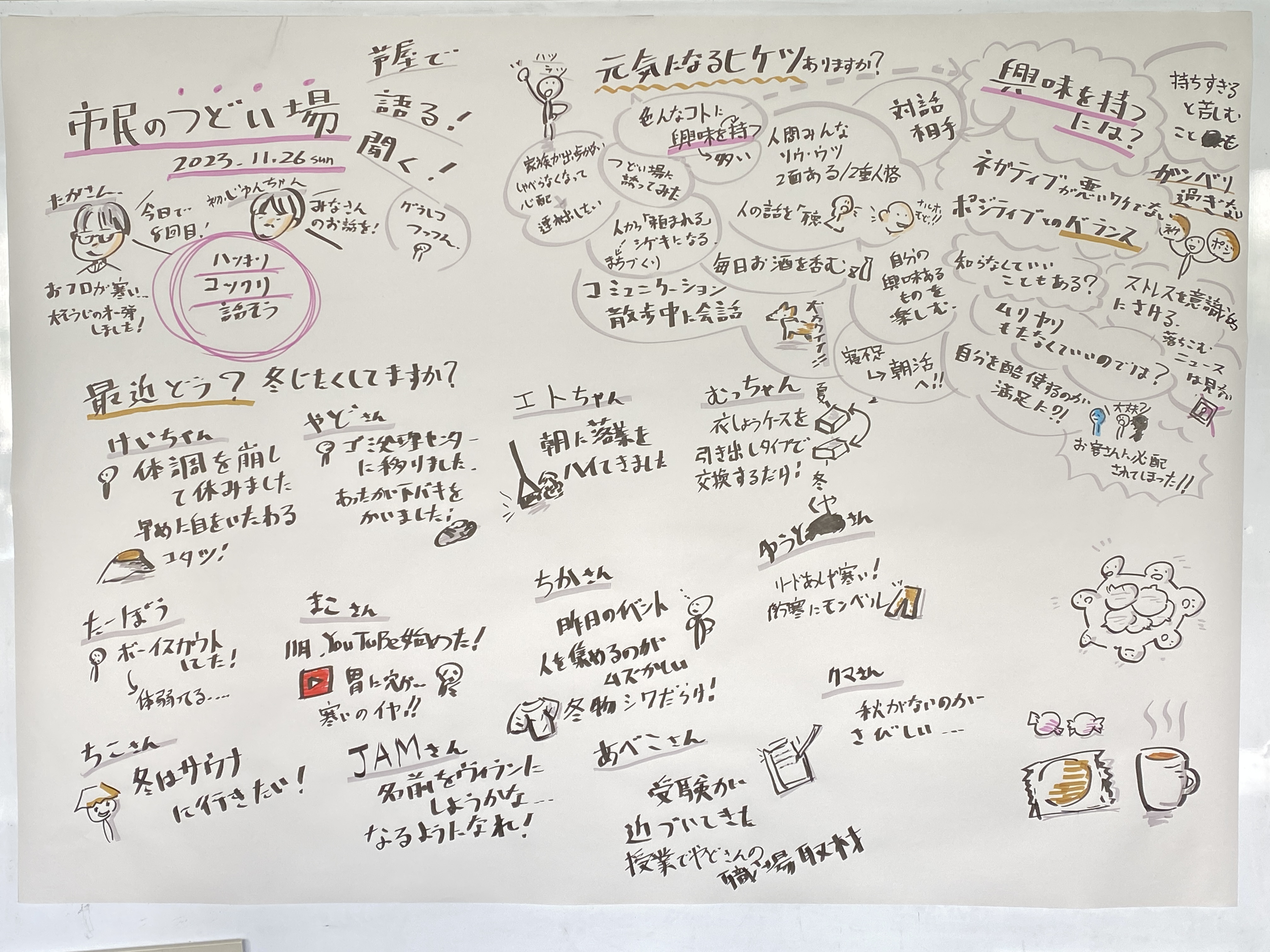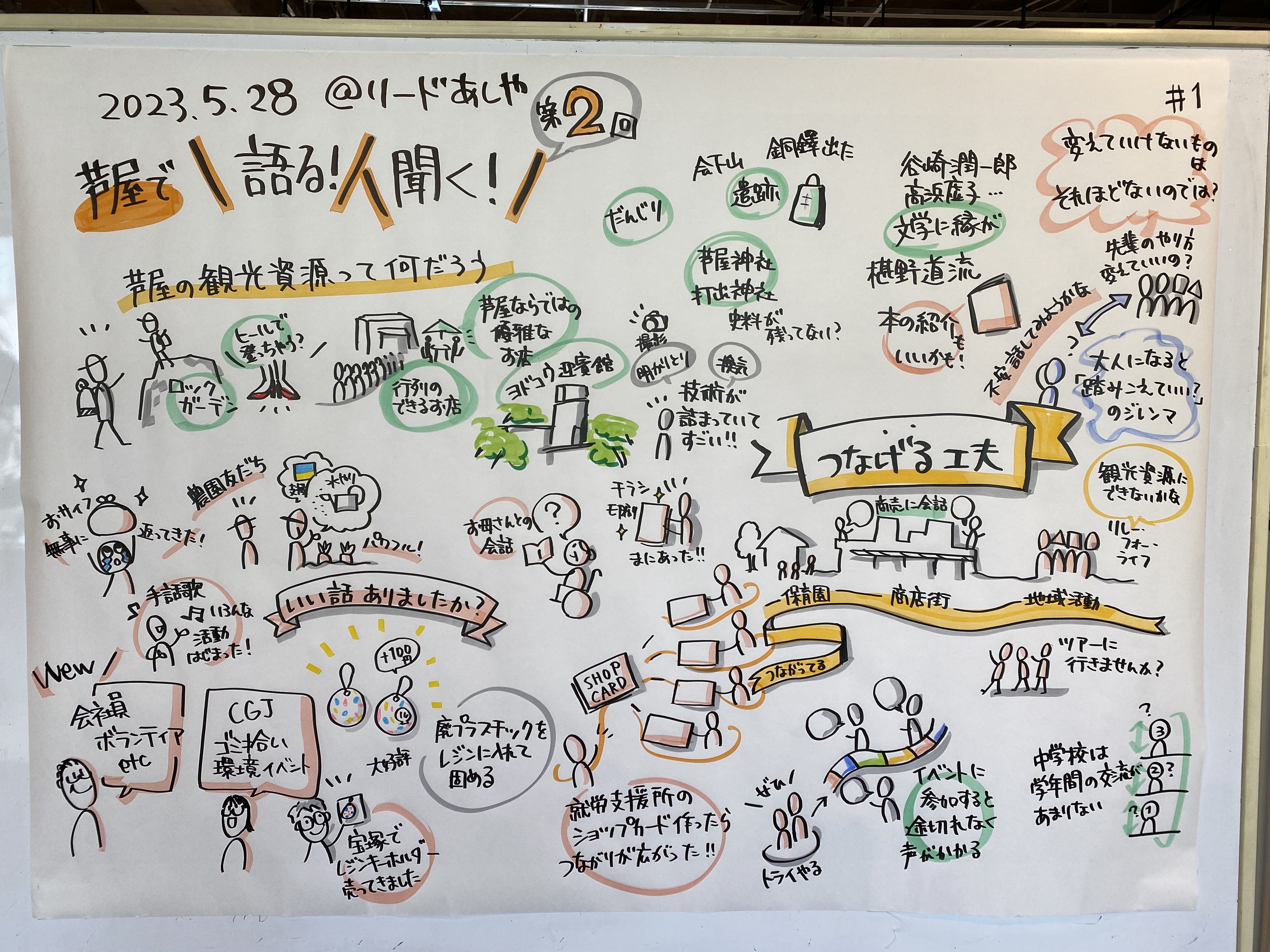 芦屋に住んでいる人、働いている人、学んでいる人、活動している人、芦屋に関わっている人たちが集まり、自分のことを語る、日常を語る、だれかとつながる、みんなの話を聞く、みんなでワイワイできる場です。一緒に居場所をづくりをしました。
