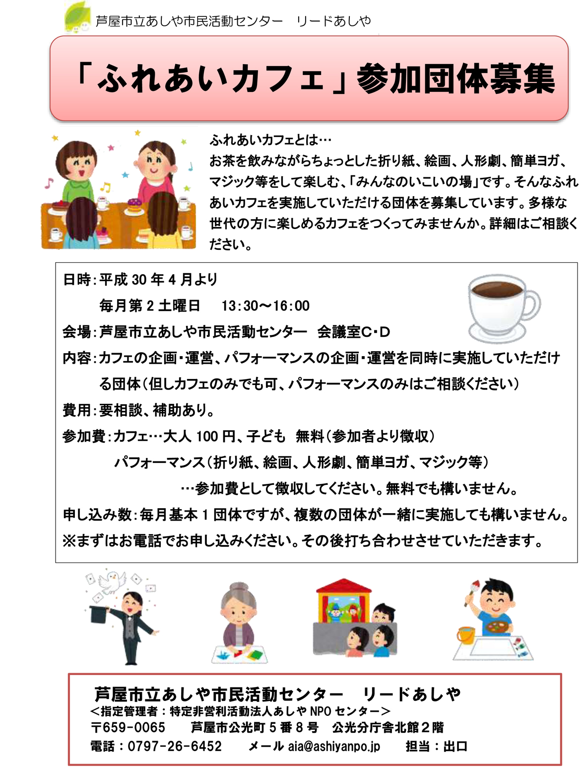 ふれあいカフェとは、市民活動団体がプログラムを提供し、市民活動団体の活躍の場にするのと同時に、定例化し市民の交流の場とすることを目的としています。毎月第2、第4土曜日を実施日としています。令和5年度運営団体は以下の通りです。まだ空きがあり、運営団体は常時募集しています。リードあしや受付にご相談ください。